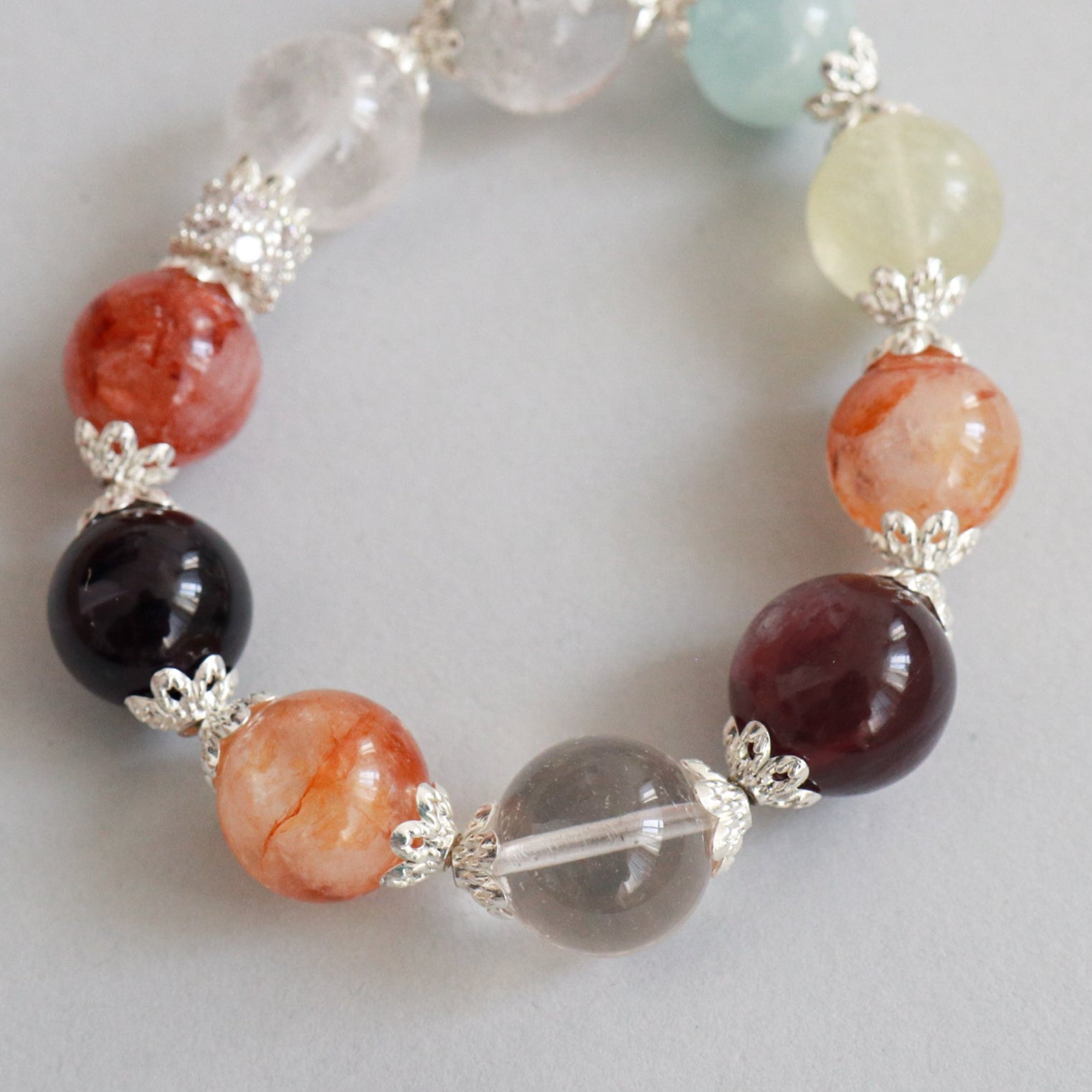 Stones include clear quartz, fire quartz, garnet, aquamarine, prehnite, smoky quartz, and more — offering a balance of grounding, brightness, and calm. The bracelet has a comforting weight and is accented with silver-toned floral and rhinestone spacers for a touch of light.