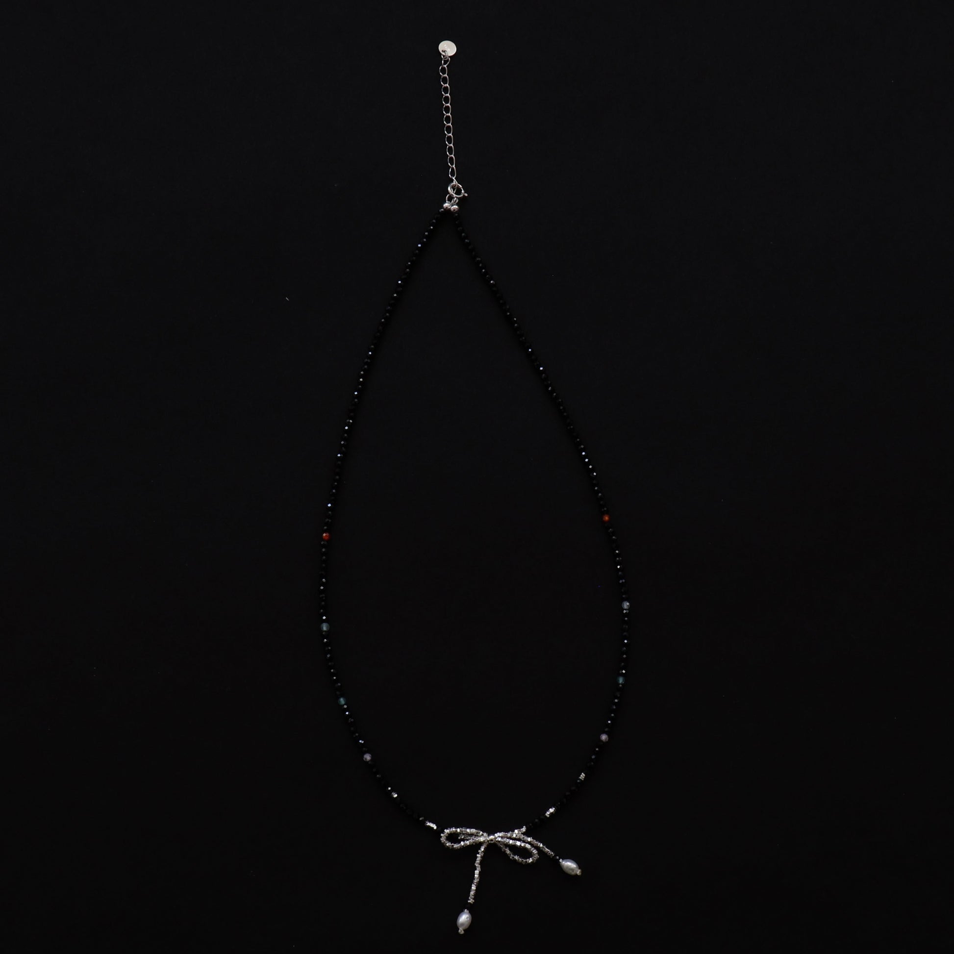 A fine strand of soft black beads, dotted with tiny freshwater pearls and finished with a hand-crafted sterling silver bow.