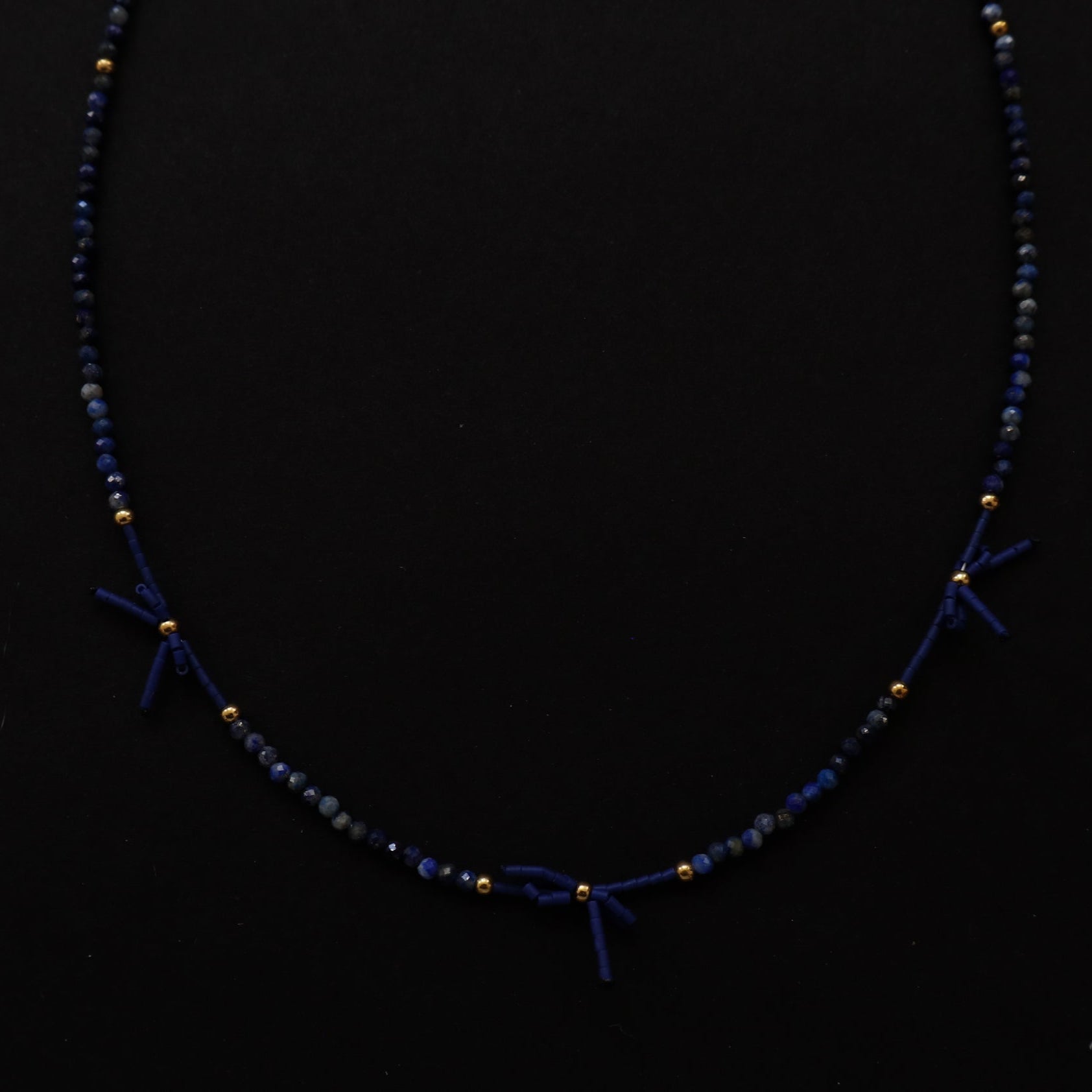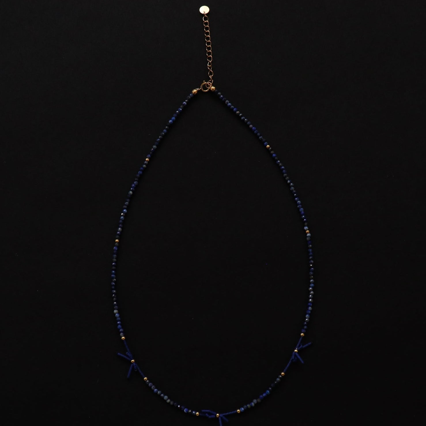 A deep blue strand of lapis lazuli, strung with warmth and care. Three delicate bows are hand-tied from the same stone, held in place with subtle gold-toned beads.