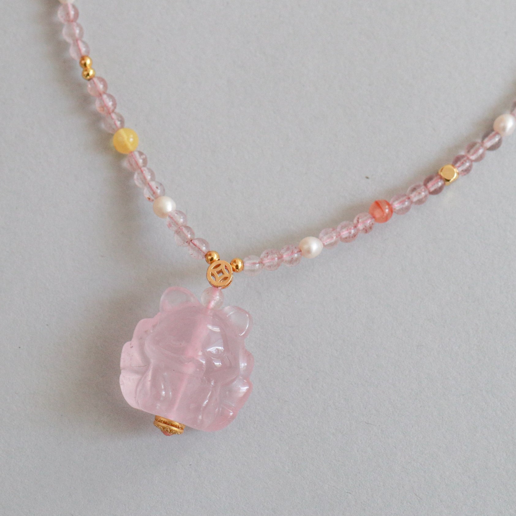 A fine beaded strand of soft pinks — strawberry quartz, Madagascar rose quartz, and warm-toned accents — centered with a hand-carved nine-tails pendant, symbolizing mystery, protection, and transformation in East Asian folklore.