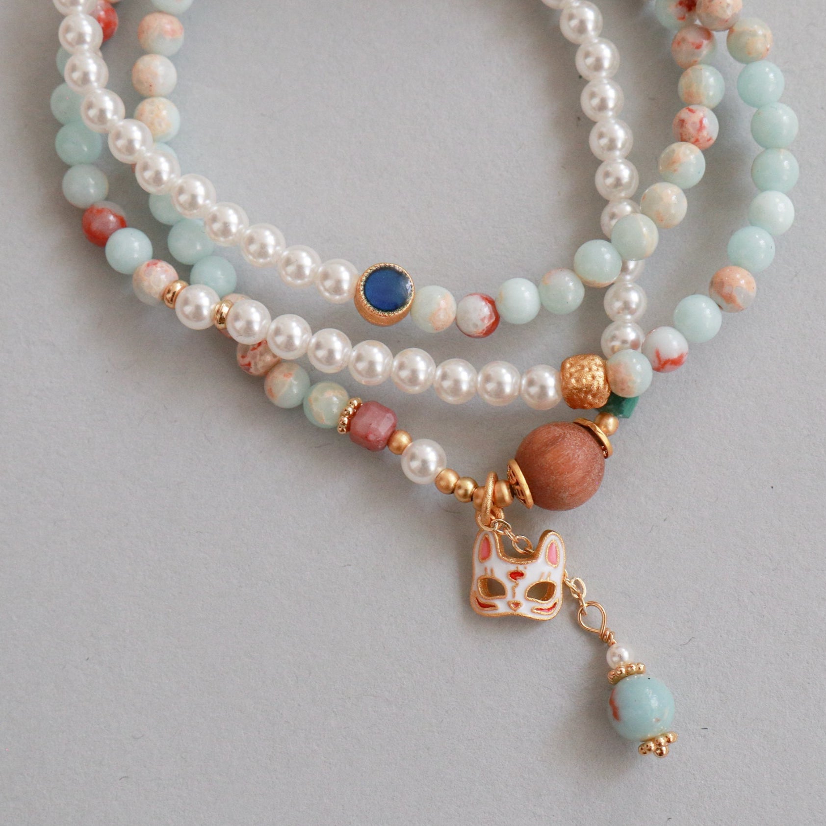 This bracelet wraps softly around the wrist in three gentle loops — a string of creamy faux pearls and warm-toned Shoushan stones, with a fox mask pendant and a touch of chinoiserie detail.
